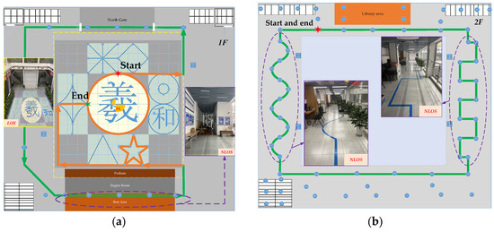 The orange test track planned on the left side of Figure 14 is the radio signal LOS area, the green track is the NLOS area and the total test length is about 156 m. The right side of Figure 14 is the second-floor area. It will penetrate the glass to reach the receiving terminal, and the length of the test track is about 116 m. Among them, the blue points are the calibration points and test points, and the star points are the starting and ending points of the test track.