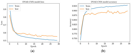 DVAE-CNN model: (a) loss curves; (b) accuracy curves.