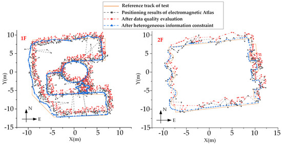 As can be seen from Figure 18, the orange line is the reference track, and the positioning coordinate system is the Gaussian plane rectangular coordinate system. The black track is the positioning track of the multi-dimensional atlas, the position deviation is large and there are results of passing through the wall; these results are considered unreliable. After adding the credible evaluation model, there is a red trajectory. Through the credible analysis and elimination of the multi-dimensional data, the data at the current moment are generated in combination with historical data to ensure the continuity of the positioning results. In order to further improve the reliability of the positioning results, heterogeneous information is introduced to constrain the positioning results. It can be seen that the positioning accuracy and reliability of the fusion system are significantly improved.