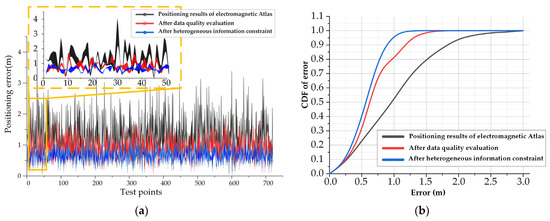 In order to analyze the effectiveness of the credible evaluation system more clearly, the error bands and error cumulative distribution functions of the three trajectories are drawn, as shown in Figure 19. The use of the error band instead of the error curve is to evaluate the positioning error more scientifically and objectively through the confidence interval. The blue trajectory is the result after being constrained by the credible evaluation method. The average positioning error is 0.56 m, the maximum positioning error is 1.25 m and 95.2% of the errors are less than 1 m. Compared with the positioning results without additional evaluation, the average positioning accuracy is improved by 74.6%.
