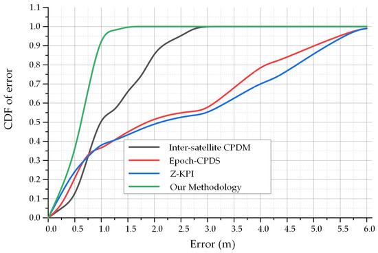 As can be seen from Figure 20, the Epoch-CPDS and Z-KPI algorithms proposed in [28,29] did not consider the localization problem in non-LOS environments. Therefore, in the test environment of this paper, the errors of these two algorithms are relatively large, and the average errors are 3.41 m and 3.38 m, respectively. The Inter-satellite CPDM algorithm proposed in document [27], since abnormal situations such as a signal loss of lock and environmental interference are not considered, the average positioning accuracy is 1.29 m, and the maximum error is 3.32 m. Compared with other methods, the method in this paper not only improves the coverage of high-precision positioning, but also improves the reliability of the positioning system. Compared with the three methods [27,28,29], the average positioning accuracy is improved by about 56%, 83.5% and 82.9%, respectively. The specific analysis is shown in the Table 3.