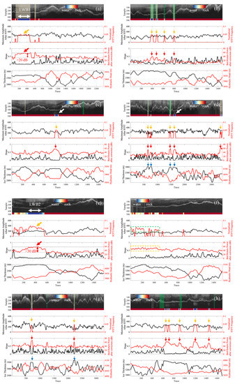 where is the detection value; is the normalized maximum frequency of the A-scope after the STFT, i.e., the frequency divided by the sampling frequency of that A-scope; is the magnitude of that maximum frequency; is the terrain slope, where ∆z is the elevation difference between two adjacent traces’ main peaks and ∆x is the horizontal distance between those two adjacent traces; and α is the weight of the terrain slope. The bigger α is, the greater the influence of the terrain slope on the results, and in the AGAP region, it is empirically determined as 5 to be statistically sound.