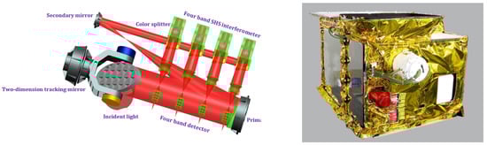 The GMI beam splitter adopts the principles of spatial heterodyne spectrum technology, which makes it different from a traditional Michelson interferometer. Diffraction gratings are used to replace plane mirrors. After a beam with a certain solid angle enters the beam splitter through a collimating lens, it is divided into two coherent beams with similar energy. After the beam is diffracted by two arm gratings, it returns to the beam splitter for interference. The array detector is used to collect interference images [12]. GMI has four optical channels: the O2 channel (0.765 μm), the CO2 weak absorption channel (1.575 μm) (defined as CO2-1), the CO2 strong absorption channel (2.050 μm) (defined as CO2-2) and the CH4 channel (1.650 μm).The working process of the payload is that the incident light is reflected by a two-dimensional pointing mirror and then enters the Gregory reflecting telescope. After the beam diameter is compressed, it enters the color splitter and is divided into four wave bands of incident light. The incident light of each wave band is modulated by interference through an interference body mainly composed of a beam splitter, a field expanding prism and a blazed light grid. After the interference is completed, it is imaged by the imaging lens of the detector and then goes through data acquisition. The interference spectrum data are preprocessed and transmitted to the output. The optical composition of the system is shown in Figure 1.