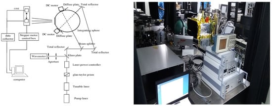 Before the GMI’s launch, a large amount of laboratory spectral and radiometric calibration work was carried out. The spectral calibration used the combination of an integrating sphere light source (SIRCUS) (as shown in Figure 3) with an external tunable laser and gas absorption method for fine calibration, and the spectral calibration accuracy reached 0.008 . In order to eliminate the influence of oxygen, carbon dioxide and water vapor in the air on the radiometric calibration accuracy, a nitrogen-filled circular replacement standard integrating the sphere radiation standard source (as is shown in Figure 4) was developed, which ensured that the integrating sphere was full of nitrogen without gas absorption and the payload absolute radiometric calibration was better than 4% [14].