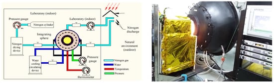 Schematic diagram of the nitrogen circulation standard integrating sphere radiation source (left figure) and the radiation calibration experiment (right figure).