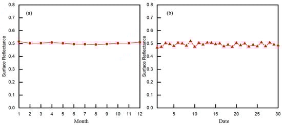 It can be seen from the analysis in Table 2 that the surface reflectance of each pixel in the Kufra, Libya site area shows little change, so the typical value of the surface reflectance of this calibration field can be characterized by the mean value method. The monthly average surface reflectivity of the Kufra, Libya site in 2018 is shown in Figure 7a. The annual average surface reflectivity is 0.5020, and the standard deviation is 0.2%. At the same time, in order to analyze whether the surface reflectivity of the Kufra, Libya site fluctuates significantly over short time periods, we also analyzed the surface reflectivity of July 2018 with many acquired day-by-day values. The statistical results are shown in Figure 7b and show a variance of 0.02%. The results show that the surface reflectivity of the Kufra, Libya site does not fluctuate significantly over short time periods.