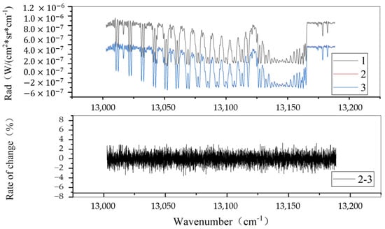 Figure 8 shows the comparison between the original spectral map (curves 1 and 2) of the data of the two observation points and the spectral data (curve 3) after excluding the influence of the solar altitude angle via Formulas (2–4). From the figure, it can be seen that after excluding the influence of the solar altitude angle, the spectra of the data of the two observation points are similar, indicating that the radiation characteristics of the Kufra, Libya site are stable and that the spectral data observed at different transit times are consistent (the maximum change rate is 3.1%).