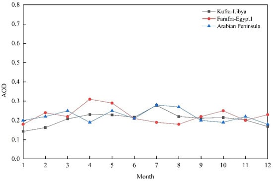 During site calibration, radiation transfer between the space and the ground is realized through radiation transfer. The RTM we adopt in this study is SCIATRAN v3.5, which was developed by V.V. Rozanov and A.V. Rozanov [20] and adopted by GMI retrieval [6]. Aerosol optical depth (AOD) is an important parameter in the atmosphere. MODIS Terra (MOD04) and MODIS Aqua (MYD04) products can provide aerosol optical thicknesses of four spectral bands, 0.47 μm, 0.55 μm, 0.66 μm and 2.13 μm, respectively. Using 0.55, 0.66 and 2.13 μm aerosol products for wavelength interpolation, the aerosol optical thickness of four GMI spectral channels (0.76 μm, 1.575 μm, 1.65 μm, 2.05 μm) can be obtained. Figure 10 shows the monthly average statistical results of aerosol optical thickness (wavelength = 550 nm) in Kufra, Libya, Farafra, Egypt 1 and the Arabian Peninsula in 2018. The statistical results show that the aerosol content in the three sites is low, and there is no significant fluctuation in the aerosol content in different time ranges. Generally, AOD < 0.3, so the requirements for AOD content in site calibration were met.