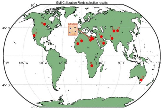 GMI digital calibration field network selection results (red circles and numbers represent the calibration field and its serial number).