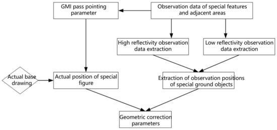 The GMI is a non-imaging instrument, and the difference between the theoretical pointing position and the actual pointing position will cause observation error in the sudden change area of the ground. Therefore, before the observation data matches the calibration field, it is necessary to use the statistical analysis of the data to establish the relationship equation between the actual pointing and the theoretical pointing error to solve the longitude and latitude migration parameters and correct the longitude and latitude of the observation data to achieve the unity of observation and pointing. The premise of matching the actual calibration observation data with the effective site is to accurately align the GMI observation points. Due to the uniform geomorphology of the coastline area and the large difference in reflectivity between the land and the ocean surface, the average DN value of the interferograms of observation points on the ocean is much smaller than that on the land. When the average DN value of the observation point is the middle value, the point will fall on the coastline with a large probability. Therefore, the geometric position correction of GMI can be completed by using the characteristics of the observation point interference image. Figure 12 shows the flow chart of GMI geometric processing.