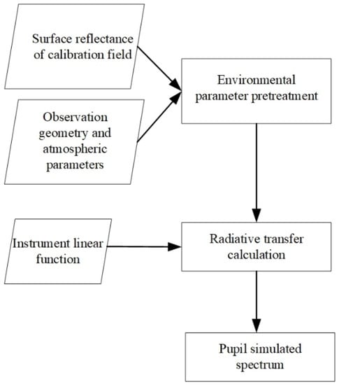 The GMI was developed based on spatial heterodyne interference technology, and its spectral resolution is extremely high. Therefore, in the process of site calibration, it is necessary to use a high-precision hyperspectral radiation transfer model to simulate the instrument’s entrance pupil radiance spectrum at the observation time of the calibration field, according to the surface characteristic parameters and atmospheric environment parameters (See Figure 16). The working band of the SCIATRAN radiative transfer model is from ultraviolet to near-infrared, and the spectral resolution also meets the requirements for a simulated spectrum in GMI site calibration. During the calculation of the GMI site calibration coefficient, the surface reflectivity, atmospheric parameter information and auxiliary parameters of the calibration observation data (observation geometry, platform parameters, time, etc.) of the calibration site must first be obtained using MODIS data products, and then this information must be input into the high-precision radiative transfer calculation model SCIATRAN after preprocessing to calculate the radiance data at the entrance pupil of the ultra-high spectrum. The spectral radiance at the entrance pupil is convolved with the instrument linear function of the corresponding channel of the load, and finally the simulated spectrum is obtained.