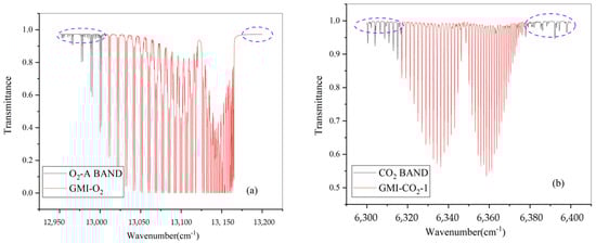 For spectral-type greenhouse gas satellite load observation data, the method of determining the baseline within the spectral range can reflect the in-orbit operation of the load well. Figure 17 (left) shows the spectrum range of the O2 channel and the actual spectrum range of the GMI observation data. Figure 17 (right) shows the spectrum range of the CO2-1 channel and the actual spectrum range of the GMI observation data. Because the corresponding spectral range of the GMI actual observation channel is narrow and the spectral absorption is rich, it is difficult to determine the baseline within the GMI observation spectral range to calculate the site calibration coefficient.