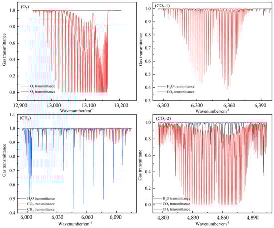 Neither the calculation method of the site calibration coefficient of the traditional imaging instrument nor the spectral baseline calculation method is applicable to the GMI, so this section will calculate the site calibration coefficient by analyzing the main gas collection of the corresponding band of the four channels of the GMI and selecting the wavelength points that have lower absorption rates of other gases in the band range that can directly reflect the in-orbit performance of the instrument. The O2 channel is mainly affected by O2 and O3. The range of the CO2-1 channel is mainly affected by H2O and CO2. The range of the CH4 channel is mainly affected by H2O, CO2, and CH4. The CO2 channel is mainly affected by H2O, CO2, and CH4. The calibration site is a clean area with a greenhouse gas background that is far away from any industrial building areas, with no interference and no external input. This is so that the stability of the gas in the calibration field in maintained. As is shown in Figure 18, the transmissivity of the main gas in each of the four channels of the GMI is calculated via the radiation transfer model to reflect the absorption of the gas in the band. Different wavelengths have different degrees of absorption of different gas components. The corresponding transmissivity of each wavelength point is superimposed to calculate the total transmissivity of each wavelength point. The wavelength point with the smallest impact on the absorption should have the largest corresponding total transmissivity, excluding the external impact of atmospheric component absorption, which can best reflect the radiation performance of the instrument itself and can be used as the wavelength point for the calculation of the calibration coefficient of the research site.