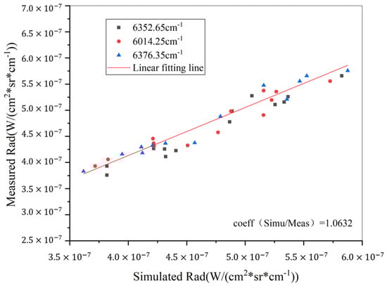 Selecting the calibration data of a single calibration site to calculate the site calibration coefficient may lead to large errors. Therefore, it is necessary to calculate the site calibration coefficient of the instrument through multiple effective observation data of the site, eliminate obvious unreasonable result values and obtain the site calibration coefficient within a certain period of time at the calibration site using fitting calculations to characterize the site calibration coefficient of the instrument. The site calibration coefficient results of the CO2-1 channel from the observed data that meet the site calibration conditions during the three months from September to November 2018 at the Kufra, Libya site are shown in Figure 19. The ordinate is the radiance value of the non-absorbable wave number corresponding to the measured spectrum of the observed data (6314.25/6352.65/6376.35 cm−1), and the abscissa is the radiance value of the wave number corresponding to the simulated spectrum of the SCIATRAN model radiation transfer calculation at the corresponding observation time. Fitting different points in the figure can help us to avoid the random error of a single point when calculating the site calibration coefficient. The calculation results show that the site calibration coefficient of the CO2-1 channel at the Kufra, Libya site is about 1.0632 during the three months from September to November 2018, reflecting the good in-orbit operation of the GMI and almost no attenuation of the radiation performance.
