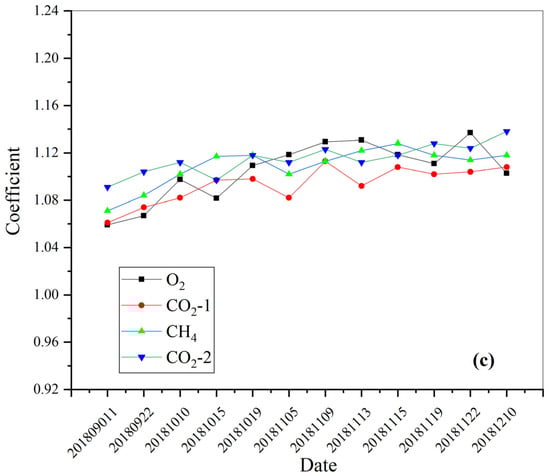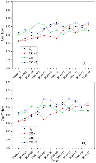 The statistical results of the effective site calibration coefficient of the GMI channel are as follows: the range of the site calibration coefficient of the O2 channel is 1.05–1.15, the average value is 1.10 and the standard deviation is 2.72%. The calibration coefficient of the CO2-1 channel site is 1.05–1.13, the mean value is 1.09 and the standard deviation is 2.64%. The calibration coefficient range of the CH4 channel site is 1.08–1.10, the average value is 1.11 and the standard deviation is 2.73%. The calibration coefficient range of the CO2-2 channel site is 1.09–1.14, the average value is 1.12 and the standard deviation is 2.93%. The above results indicate that site calibration for the GMI should be carried out within a certain time range. The GMI can monitor the radiation performance attenuation of each channel in this period of time and modify the remote sensing data to a certain extent according to the site calibration coefficient.