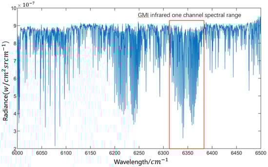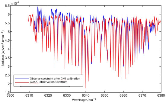 The GOSAT data mainly consist of the following levels: L0, FTS-L1A, FTS-SWIR L1B, FTS-TIR L1B, CAI L1B, FTS-SWIR L2, CAI L2, FTS-SWIR L3 and CAI L3 products. This article mainly uses the downloadable FTS L1B data from the official website of the GOSAT (https://data2.gosat.nies.go.jp, accessed on 1 November 2018). The product data are mainly GOSAT spectral data after phase correction, inverse Fourier transform, radiometric calibration, spectral calibration and geometric calibration. By downloading and processing the FTS L1B data products, the GOSAT observation spectra required for cross validation can be obtained. Figure 21 shows the observed spectrum of the GOSAT Band2 read from the FTS L1B data. The spectral range of the GOSAT Band2 channel is 5800 cm−1–6400 cm−1, and the spectral range of the GMI CH4 channel is 6317 cm−1–6377 cm−1. The spectral range of the GOSAT channel is much wider than that of the corresponding GMI channel. The spectral range of the GOSAT channel includes the complete spectral range of the corresponding channel of the GMI. Therefore, the GOSAT observation spectrum and GMI observation spectrum can be used for cross-validation.