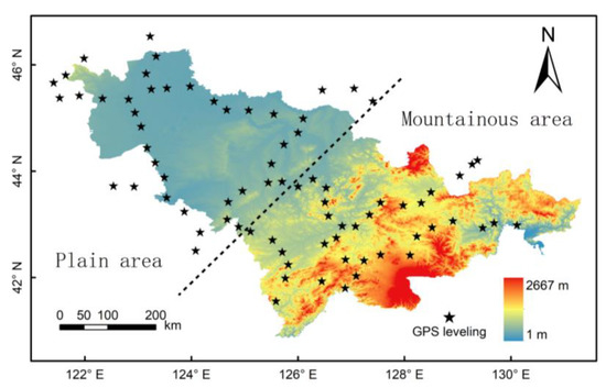 36]. The 77 high-precision GPS/leveling points were used to evaluate the geoid modeling in and around Jilin Province, including 41 in plain and 36 in mountainous areas. The GPS/leveling points use the CGCS2000 national geodetic coordinate system and the 1985 national height datum of China as horizontal and vertical datum, respectively, with ±1.0 cm accuracy in horizontal and vertical.