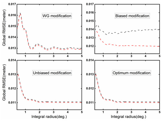 The global RMSE obtained by different integral radii (black line, Stokes’s formula; red line, Hotine’s formula).