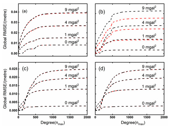 The global RMSE obtained by different terrestrial gravity data error variances: (a) WG modification, (b) biased modification, (c) unbiased modification, and (d) optimum modification. (Black line, Stokes’s formula; red line, Hotine’s formula).