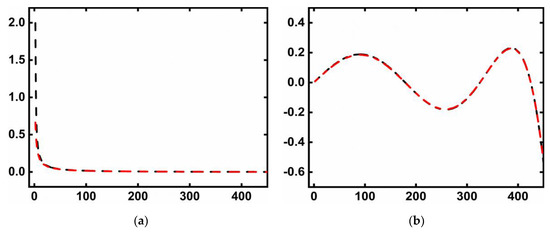 Modification parameters’ : (a) for the biased modification and (b) for the unbiased modification. (Black line, Stokes’s formula; red line, Hotine’s formula).