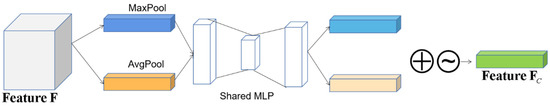 Figure 4 shows the structure of the channel attention module CA. It models the importance of each feature channel and then enhances or suppresses different channels. The output of ASPP is used as the input of channel attention. goes through the maximum pooling layer and the average pooling layer. The two outputs are connected to the same MLP, and their parameters are shared. The two outputs of MLP are added, and a sigmoid function is finally connected to obtain .