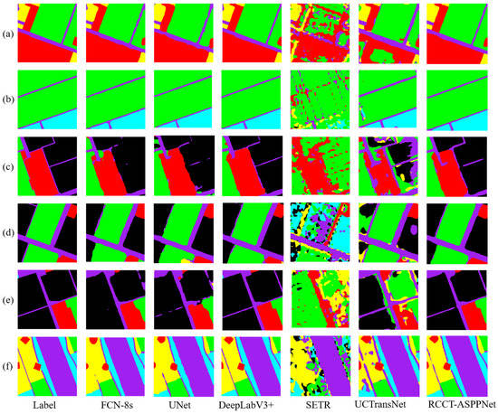 The performance of the six models on Farmland and AeroScapes is compared, as presented in Table 4. Among all the models, SETR has the worst results on both datasets because the simple Transformer model does not combine multiscale features and loses many low-level semantic features. In addition, the SETR model is more homogeneous and difficult to segment remote images in complex situations. The FCN-8s network model uses multiscale feature fusion, which can effectively learn multiple features while upsampling using deconvolution, preserving the spatial information of the original input image. However, FCN-8s performs poorly in AeroScapes images with multiple categories and views, with only 40.23% mIoU. The reason is that FCN-8s has difficulty extracting higher-level features and the multiscale fusion approach is simply concatenated, which does not sufficiently learn the relationships among the feature layers. The ASPP module of DeepLabV3+ convolution with higher-level features at different dilate rates extracts the feature information under different fields of view and fuses the lower-level feature layers. The mIoU of DeepLabV3+ on Farmland and AeroScapes is 92.80% and 59.63%, respectively, which achieved good results but at the same time ignored the cross information between feature layers; the mPA of DeepLabV3+ on AeroScapes is only 67.07%. UCTransNet used Transformer to cross-fuse all input feature layers, which solved the problem of insufficient feature fusion, and it has a mPA metric of 81.67% on dataset AeroScapes, which exceeds most network models; this shows that UCTransNet has better performance in handling multi-category and multi-angle datasets. However, the different fields of view of feature layers are equally important; therefore, UCTransNet does not perform as well as the CNN-based model on Farmland. RCCT-ASPPNet cross-fuses some input features and then uses the residual method to connect the front and back feature layers as an encoder. Meanwhile, RCCT-ASPPNet uses the ASPP module to process the high-level features and CBAM to learn the channel and spatial information, which is the second encoder. RCCT-ASPPNet considers the feature fusion method and the field of view information of the feature layer to achieve optimal results on both Farmland and AeroScapes.