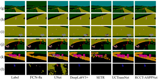 AeroScapes data prediction results, from left to right, are real labels, FCN, UNet, DeeoLabV3+, SETR, UCTransNet, and RCCT-ASPPNet, from top to bottom, (g–l) are the selected 6 sets of AeroScapes test images.