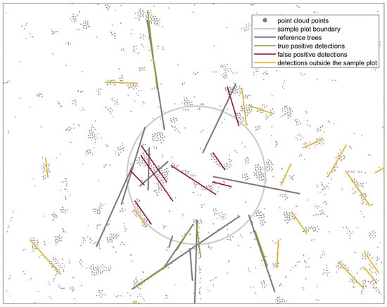 - The HR used in height-based filtering. We kept the upper limit fixed at 1 m but varied the lower limit between 0.1, 0.2, and 0.3 m. Errors in ground extraction resulted in some ground points being classified as above-ground points. Furthermore, ground vegetation was often dense close to the forest floor. For these reasons, setting the lower height limit to exactly zero results in a dense point cloud and a large number of false fallen tree detections. Setting the lower height limit to a value slightly larger than zero mitigates this issue but prevents the detection of fallen trees located very close to or laying entirely on the forest floor.