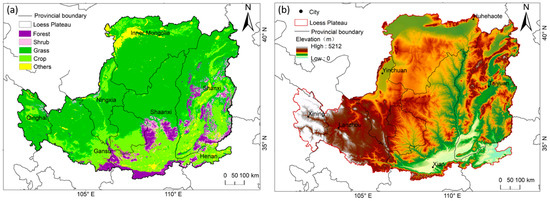 The CLP (36°10′36″–37°02′05″N, 109°14′10″–110°05′43″E) covers an area of about 640,000 km2, covering all or part of the seven cities in Qinghai, Gansu, Ningxia, Shaanxi, Shanxi, Henan, and Inner Mongolia (Figure 1a). It belongs to a temperate continental monsoon climate, a semi-arid and semi-humid climate zone with loose soil and serious soil and water flow. The terrain of the CLP is high in the northwest and low in the southeast, with a wavy decline from northwest to southeast (Figure 1b). The CLP suffers from severe water shortage, with an average annual precipitation of 440 ± 50 mm y−1, of which about 85% is evaporated [2]. The vegetation in this area is mainly grassland, farmland, and forest (Figure 1a). The vegetation is seriously degraded, and the ecological environment is very fragile.