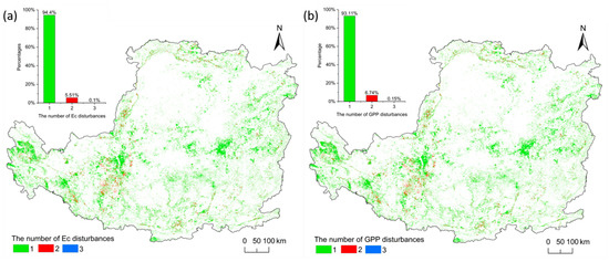 In this study, the change of GPP and Ec values that decreased by more than 10% was extracted to obtain the number of disturbances. From 2001 to 2020, pixels experienced between zero and four breakpoints. Since the number of pixels with four breakpoints is less than 5, we ignored the statistical analysis of the pixels with it. As for disturbance pixels of Ec (Figure 4a), 94.4% disturbance pixels had one breakpoint, followed by two breakpoints (5.51%) and three breakpoints (0.1%). A total of 93.11% disturbance pixels of GPP had one breakpoint (Figure 4b), followed by two breakpoints (6.74%) and three breakpoints (0.15%). The spatial disturbance of the number of breakpoints shows a large variability, with all breakpoint classes having discrete disturbances.