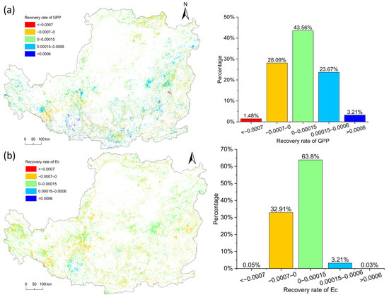 Spatial distribution of the recovery rate and the percentage of different intervals of the recovery rate: (a) GPP; (b) Ec.