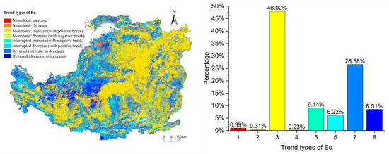 The percentage of Ec trend types are shown in Figure 7. The maximum percentage of Ec trend type is type 3 (48.02%), followed by type 7 (26.58%). The minimum percentage of trend type is type 4 (0.23%), followed by type 1 (0.99%). Overall, the rising trend type of the Ec accounts for 66.66%, and the decline trend type accounts for 33.34%. Spatially, type 3 is mainly distributed in the northeast and southwest of the CLP and is concentrated in the north of Shanxi Province.