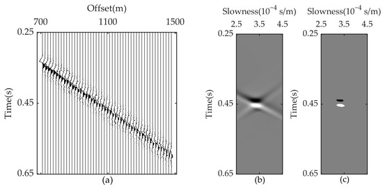 Due to the limitation of seismic acquisition space, the superposition during the Radon transform can only be performed in the limited temporal domain, which will be affected by the smooth effect. As well as the least squares algorithm may produce artifacts in the Radon domain, the energy convergence in the Radon model will be influenced. To obtain a Radon model with more concentrated effective signal energy, we apply the sparse Radon transform based on iterative model shrinkage (SRTIS) [41,42]. In each iteration of the SRTIS, the Radon model updates can be expressed as:
