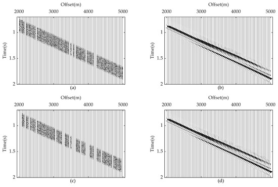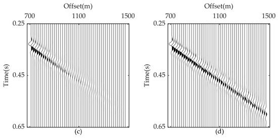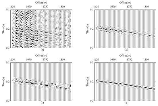 A shallow, first arrival refraction dataset collected in Gansu Province, China, is processed to verify the application of the proposed method in the actual situation. There are 19 shots stimulated, received by 71 receivers on the surface. Figure 9a shows one shot of this dataset. It can be seen that there exists strong noise interference in the first 30 traces, with the consistency of the first arrivals destroyed at the last 20 traces, making it difficult to pick accurately. The raw seismic records are windowed first to obtain the first arrival data for the following process, as shown in Figure 9b. The conventional SVI and RDSVI are both used to reconstruct the first arrivals, and the results are presented in Figure 9c,d, respectively. It can be seen from Figure 9c that the amplitude of first arrivals was enhanced through conventional SVI; however, the continuity of the event is still not recovered, and new interference artifacts are introduced into the retrieved traces at the same time, which may affect the subsequent first arrival picking, whereas the RDSVI method attenuates the noise at the first 30 traces well, and the continuity of the last 20 traces is recovered in the meantime. The amplitude and phase of first arrivals at all offsets are clear and easy to recognize, as Figure 9d presents.
