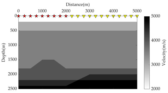 To demonstrate the effectiveness of our method, a velocity model (Figure 4) is used to generate the synthetic seismic record. The 101 sources (red stars) are placed uniformly on the surface with a distribution range of 0–2000 m at 20 m shot intervals. The 251 receivers (yellow triangles) evenly distributed along the surface from 0 m to 5000 m with a spacing of 20 m. Using a 2D finite-difference forward modeling program, the synthetic noise-free common shot gathers that contain all wavefields are generated. One shot with the source located at the start of the survey is shown in Figure 5a. It can be seen that the amplitude of the first arrivals at far offsets is weaker compared to that at near offsets due to the increase in wave propagation distance. Strong random Gaussian white noise is then added to the original common shot gathers, as Figure 5b presents. Since the noise seriously reduces the SNR of seismic data, the first arrivals are basically invisible now, especially at the far offset section after 3000 m, where the first arrivals are completely masked by strong noise, which sets a big obstacle for accurate first arrival picking. Windowing is applied around the first arrivals before the reconstruction. The severe noise interference in the original records makes it difficult to determine the time window; for convenience in the time window selection, we adopted a preprocessing step for the noise-contaminated common shot gathers, including band-pass filtering and f-x deconvolution. The preprocessing step can singularize the refraction event, especially at far offsets, which can help us to determine the time window. However, because the preprocessing may cause damage to the effective signal, this step only provides the basis for the selection of the time window, and the selected time window will be applied to the original noisy data in Figure 5b. The seismic data after preprocessing is presented in Figure 5c, and the zoom view of the part from 2000 m to 5000 m (red square) that contains the far offset first arrival refractions is shown in Figure 5d. To ensure all the first arrival signals are included, we choose a large time window (red rhombus) with a time length of 300 ms, such that some later arrivals after the target first arrival refractions are also included.