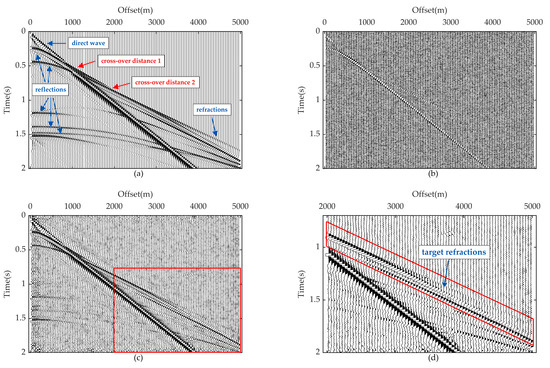 where represents the convoluted refraction. Convolution extends the ray path of refraction, and reset the virtual source to the actual source position at the surface, as presented in Figure 1b. denotes convolution. The SNR of the reconstructed refraction is further improved by integrating along the receiver domain.