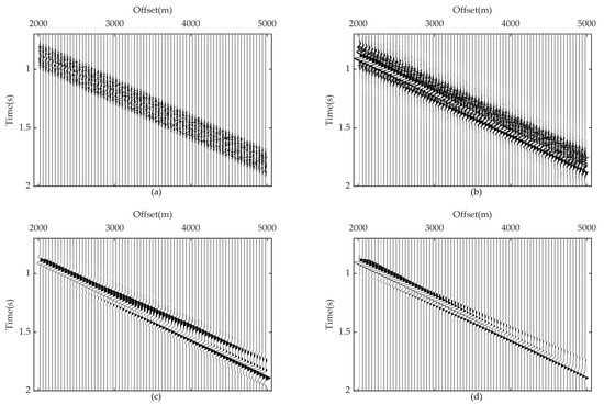 Figure 6 shows the original first arrival records and the reconstructed results of the conventional SVI and RDSVI, respectively. It can be found from the original noise-contaminated data in Figure 6a that the weak first arrival signals are almost masked by strong noise. We reconstructed the first arrivals with conventional SVI and RDSVI, and the results are shown in Figure 6b,c, respectively. The reconstruction of conventional SVI is not satisfactory; only the first arrivals between 2000 and 3000 m are enhanced to a certain extent, but there remains a lot of noise, and interference artifacts exist in the reconstructed traces. While the first arrivals after 3000 m are still unrecognizable, which does not change much compared with the original data, this indicates that, due to the strong noise susceptibility of the conventional SVI, it is not suitable for processing the first arrivals data with strong noise. In contrast, the interference of noise is eliminated during the reconstruction through RDSVI, and only a small amount of noise remains. The first arrivals at all offsets are retrieved well with an obvious phase, as Figure 6c presented. The first arrival event in the reconstructed result matches the noise-free data in Figure 6d; meanwhile, the amplitude is enhanced, which proves that this method is suitable for reconstructing the first arrivals with strong noise. To further clarify the enhancing effect of the two methods, we calculated the SNR of each reconstructed result with the help of the corresponding reconstructed results of the noise-free data [43]: