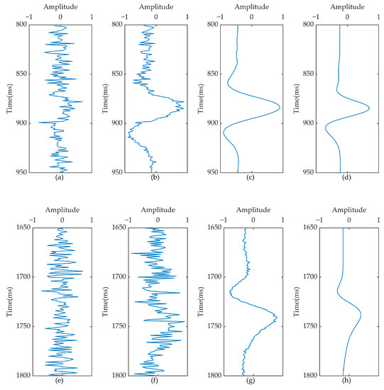 To further investigate the changes of amplitude and phase in the reconstructed results, we display the first trace and the last trace before and after reconstruction for waveform comparison, as shown in Figure 7. Figure 7a–d present the waveforms of the first trace of the four data in Figure 6, respectively. It can be seen that both retrieved traces recover the amplitude well, but due to the poor suppression of conventional SVI, the phase distortion of the first arrival signal is serious, as Figure 7b shows. In contrast, based on the excellent noise immunity of RDSVI, the phase of the retrieved signal is clear and smooth, as presented in Figure 7c. Figure 7e–h show the waveforms of the last trace of the corresponding four data. On account of the energy of the first arrival at far offset being weak, coupled with the interference by strong noise, the waveform of the original noisy data is so disordered that the first arrival signal is completely unrecognizable, let alone being picked accurately, as Figure 7e shows. The retrieved trace of conventional SVI in Figure 7f is basically no different from the original trace, the waveform is still disordered, and no effective signal can be identified. On the contrary, there are only some minor phase distortions in the retrieved trace of RDSVI, most of the noise is attenuated, and the effective signal is clear and easy to recognize. The amplitude of the first arrival signal is also enhanced compared with the noise-free trace. Both the reconstructed result and the waveform demonstrate that the RDSVI method can enhance the first arrivals well and significantly improve the SNR when processing the seismic data that interfered by strong noise.