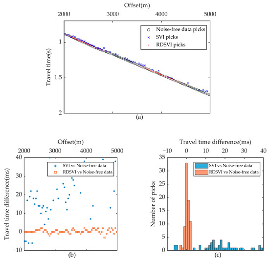 To verify the help of the reconstructed data on the first arrival picking, we performed automatic travel time picking on the first arrival data before and after reconstruction. Since the SNR of the original noisy data is too low, the first arrivals cannot be picked properly; here, we use the picks of noise-free data as the accurate result. Figure 8a shows the travel time picks versus offset for the noise-free original shot gather (black circles), the conventional SVI shot gather (blue crosses), and the RDSVI shot gather (red dots). It can be seen that there are obvious errors in the picking result of conventional SVI. Since the retrieved first arrivals at far offsets are still not well identified, resulting in missing picks at some offsets, statistics show that the missing rate reaches 46.3%, whereas the picking results of RDSVI at all offsets are in good agreement with the accurate result. Figure 8b presents the travel time difference between the reconstructed result and the accurate result, from which we could find that the time difference of the conventional SVI method is more perturbed, and the maximum time difference reaches up to 40 ms. Such an unstable picking result will greatly affect the subsequent static correction or first arrival tomography. In contrast, the time difference of the RDSVI method is more stable and the perturbation is smaller. The statistical analysis of the time difference results shows that the time difference of conventional SVI is very scattered, and all of them are more than 4 ms, which cannot meet the accuracy requirements of the first arrival picking, whereas all the time difference of RDSVI is less than 4 ms, and most of the picking results are within 2 ms, as shown in Figure 8c. The first arrival picking result demonstrates that RDSVI can reconstruct and enhance the first arrivals in the case of poor quality of the original seismic records, providing high-quality data for accurate travel time picks.