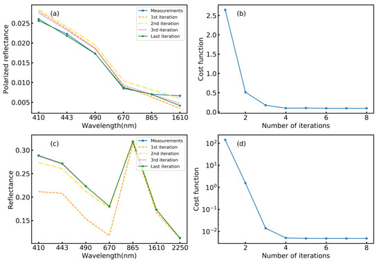 (a,c) Illustrations of the iterative process for TOA reflectance and TOA polarized reflectance, respectively. (b,d) The plot of the cost function as a function of iterations in polarization inversion and intensity inversion, respectively (case for 8 June 2022).