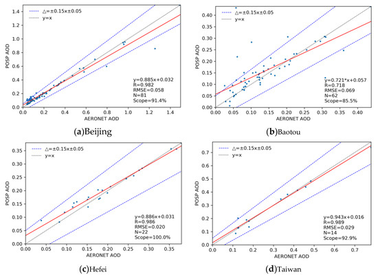 It can be found from Figure 5 that the inversion results based on the algorithm proposed in this paper are basically consistent with AOD products of the AERONET sites, and the results are good. However, due to the influences of different surface types and aerosol types, the Scope is different. The order from largest to smallest is Hefei, Taiwan, Beijing, and Baotou. The reason for this may be that the surface vegetation in the Baotou area is sparse and is often considered to be a bright surface, while the Hefei site is mostly covered by evergreen vegetation, and the surface reflectance value is relatively small, so that the impact of the surface on the apparent reflectance is relatively smaller than the bright surface.