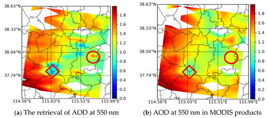 Figure 8 shows the comparison of the AOD inversion results of POSP in the low AOD value area with the MODIS product. Comparing (a) and (b), it can be found that the POSP inversion results are consistent with the MODIS product as a whole. In some areas, the inversion result of POSP is smaller than MODIS (the prismatic area in the figure). In order to further analyze the effectiveness of the inversion algorithm, the inversion results and MODIS products were statistically analyzed, and the results are shown in Figure 9.