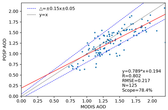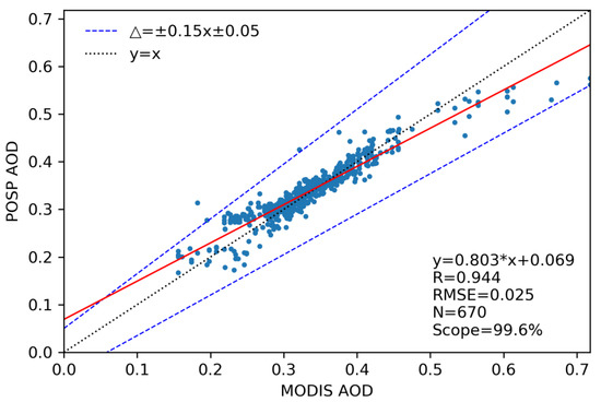 The scatter plot of POSP AOD inversion results against MODIS products (4 May 2022).