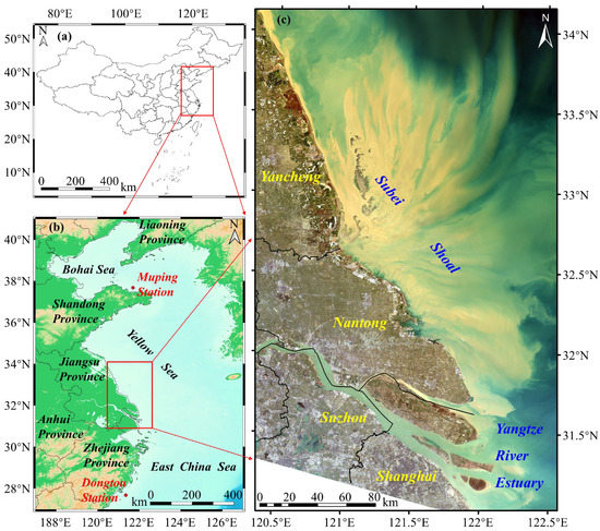 Overview of the study area. (a) Location of the East China Coast in China. (b) Overview of the East China Coast. The red dots represent the calibration stations of the National Satellite Ocean Application Service in the Yellow Sea and East China Sea. Background map obtained by GEBCO (http://www.gebco.net/, last accessed on 13 July 2022). (c) Turbid water in the Subei Shoal (SBS) and the Yangtze River Estuary (YRE). The base map is the quasi-true color georeferenced HY-1C CZI image on 27 February 2022.