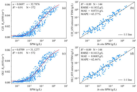 where Rrs is the atmospherically corrected remote sensing reflectance in sr−1, u and v are empirical and wavelength-dependent coefficients, and SPM is the suspended particulate matter concentration in g/L.