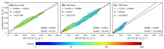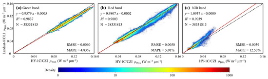 Scatterplots of CZI versus OLI of TOA reflectance at the green (a), red (b) and NIR (c) bands on 27 February 2022 in the SBS and YRE, respectively.