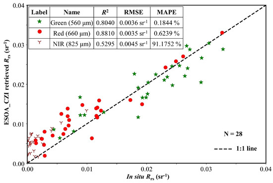 Finally, the scatter plots of the in situ measured Rrs and CZI-derived Rrs at 560, 650 and 825 nm was shown in Figure 5. As mentioned before, due to the poor atmospheric correction effect of the blue band (460 nm), it is not involved in the comparison here. The results are as follows: the R2 values of the CZI-derived Rrs and the in situ measured Rrs at green (560 nm), red (650 nm) and NIR (825 nm) bands were 0.8040, 0.8810 and 0.5295, respectively. In addition, the RMSE were 0.0036 sr−1, 0.0035 sr−1 and 0.0045 sr−1, respectively. Furthermore, the MAPE were 0.1844%, 0.6239% and 91.1752%, respectively. Most of the data are concentrated around the 1:1 line and no negative values were obtained, which indicates that ESOA_CZI algorithm performs well in these bands.