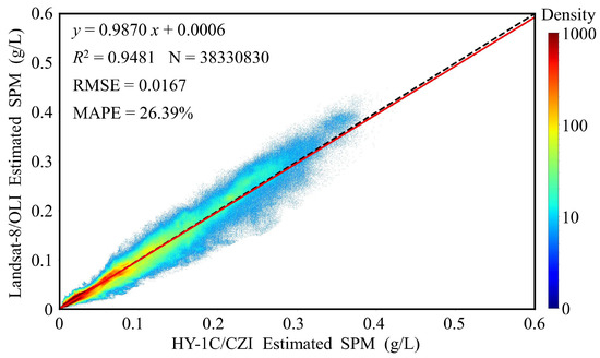 According to the results of Rrs after CZI atmospheric correction, it can be seen that Rrs in the red band has the best effect. Moreover, the Rrs in the green band is not sensitive to the change of SPM and is easy to saturate. However, the Rrs in the NIR band is less stable and likely to have negative values in the clear water area. Therefore, to illustrate the accuracy of CZI and OLI images inversion of SPM, only red band was selected to input into SERT_c model to invert SPM. The cross-comparison scatter plot of CZI and OLI image inversions of SPM are shown in Figure 6. The results show that the SPM concentration of CZI inversion was highly consistent with that of OLI inversion (R2 = 0.9481), and the slope of their linear regression fitting line was very close to 1 (slope = 0.9870), the intercept was as low as 0.0006 g/L, the RMSE was only 0.0167 g/L, and the MAPE was 26.39%. This shows that it is feasible and reliable to estimate SPM of SBS and YRE by SERT_c model using ESOA_CZI atmospheric corrected Rrs, and the future application of CZI images to long time series and large-scale SPM observation of estuarine and coastal waters has great value and potential.