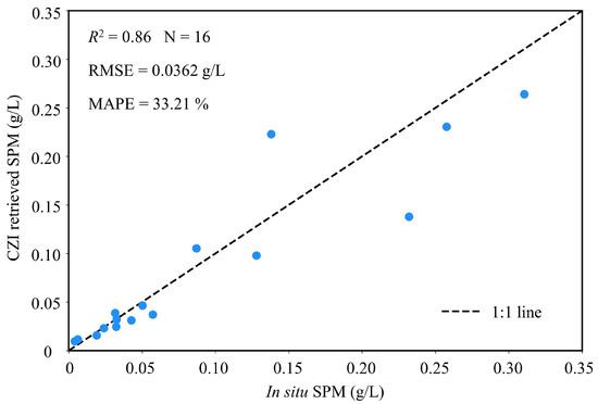To further test the performance of the CZI image quantifying SPM, we selected the SPM data quasi-synchronous (within one hour) with the local transit time of CZI images from the in situ measured SPM datasets for verification, and a total of 16 sets of SPM data were matched (Figure 8). The verification results show that the R2 values was 0.86, the RMSE was 0.0362 g/L, and the MAPE was 33.21%. Most of the data are concentrated around the 1:1 line, which indicates that the CZI images are capable of estimating the SPM distribution and variability in estuarine and coastal waters by ESOA_CZI atmospheric correction and SERT_c inversion SPM algorithm.