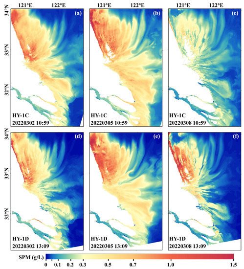 Temporal and spatial dynamics of SPM in SBS and YRE were observed using CZI images. HY-1C (a) and HY-1D (d) CZI image on 2 March 2022; HY-1C (b) and HY-1D (e) CZI image on 5 March 2022; HY-1C (c) and HY-1D (f) CZI image on 8 March 2022.